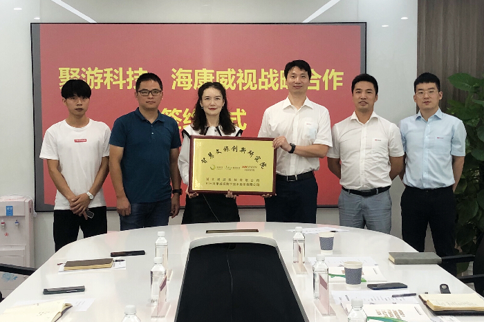 期間,??低暸c聚游科技進行了“智慧文旅創(chuàng)新研究院”授牌儀式。??低暫睒I(yè)務中心、聚游科技相關部室負責人等共同見證簽約儀式。