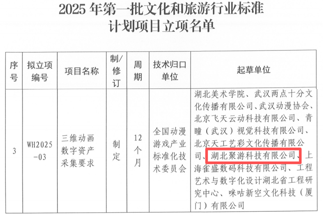 近日,文化和旅游部科技教育司發(fā)布了2025年第一批文化和旅游標(biāo)準(zhǔn)計(jì)劃項(xiàng)目立項(xiàng)名單。由數(shù)旅集團(tuán)旗下聚游科技參與制定的《三維動畫數(shù)字資產(chǎn)采集要求》成功入選,實(shí)現(xiàn)了在文旅行業(yè)標(biāo)準(zhǔn)化領(lǐng)域的重大突破。